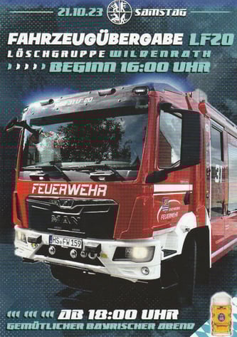 Die Löschgruppe Wildenrath der freiwilligen Feuerwehr Wegberg bekommt ein neues Löschfahrzeug! Die feierliche Fahrzeugübergabe mit Vorstellung ist am 21.10.23 ab 16:00Uhr. Anschließend ab 18:00Uhr geht man in einen gemütlichen Bayrischen Abend über.