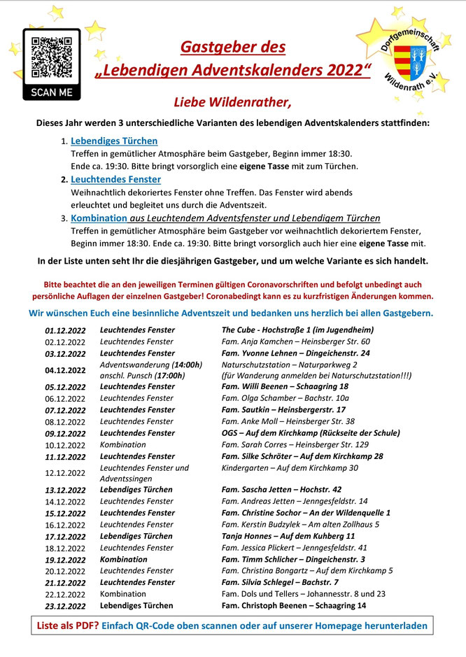 Wir freuen uns auf viele geschmückte Fenster und lebendige Türchen, und wünschen Euch bis dahin alles Gute und bleibt gesund.